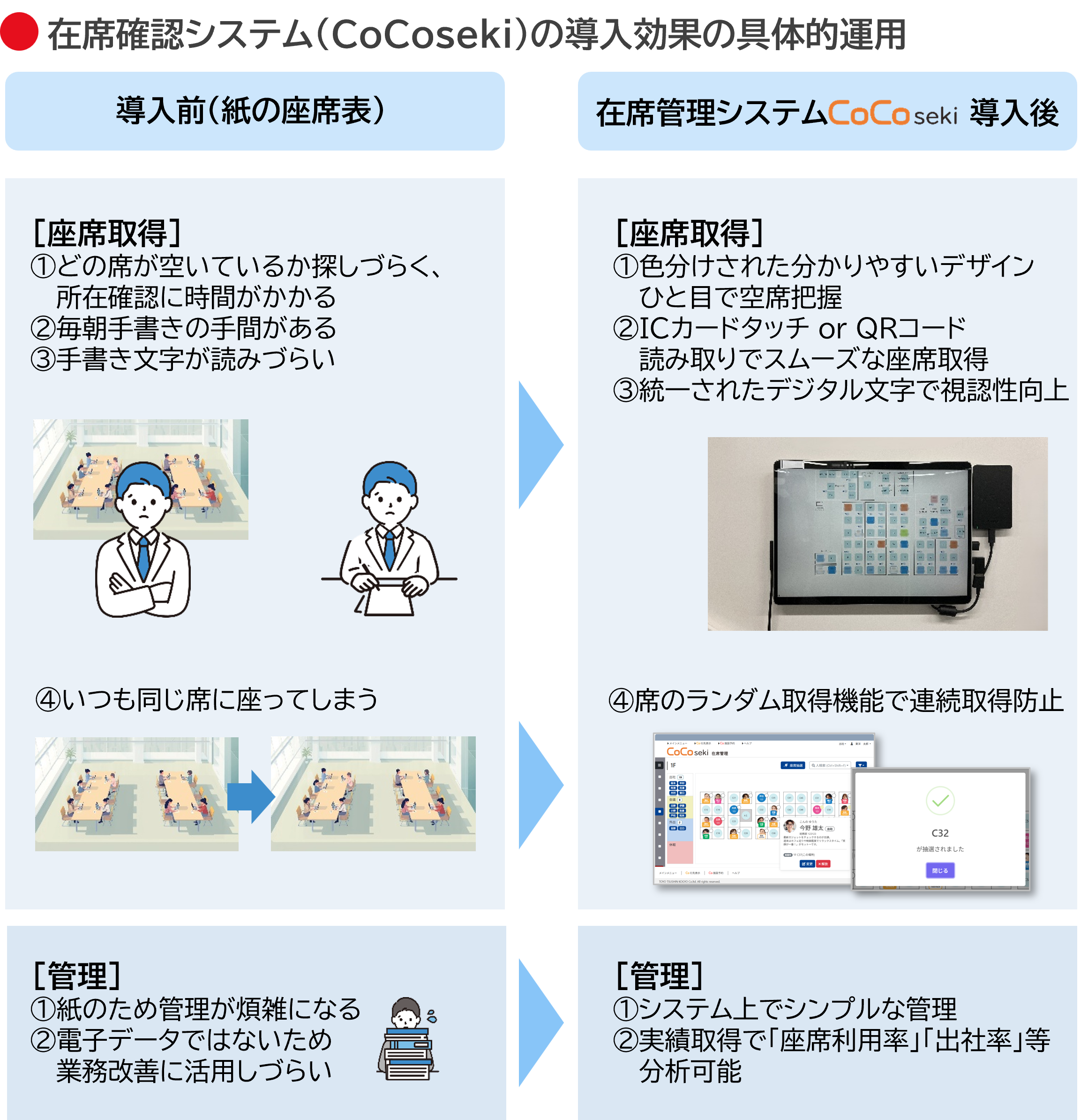 また、執務エリアがL字型で、アシスタントが固定席のため、これまでは営業担当者を探すのに時間がかかっていました。CoCosekiの導入により在席状況が可視化され、アシスタントの電話応対がスムーズになったことで、顧客満足度の向上にもつながりました。