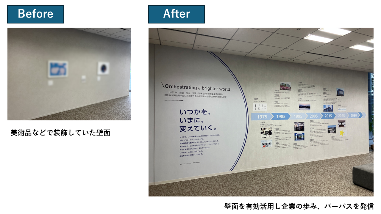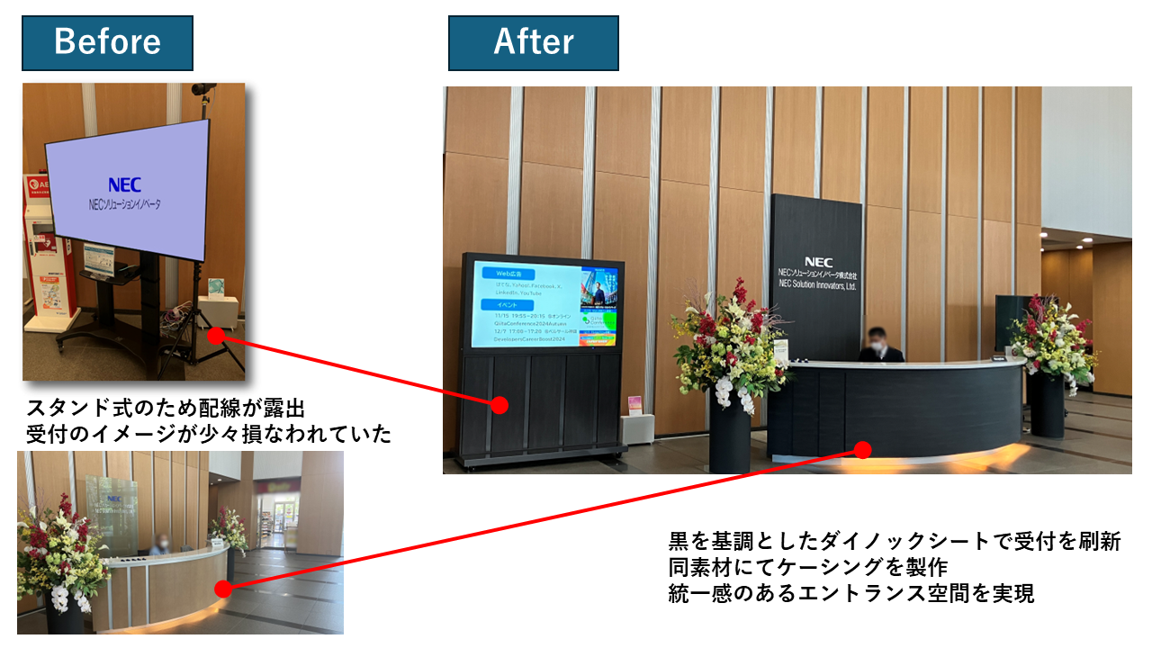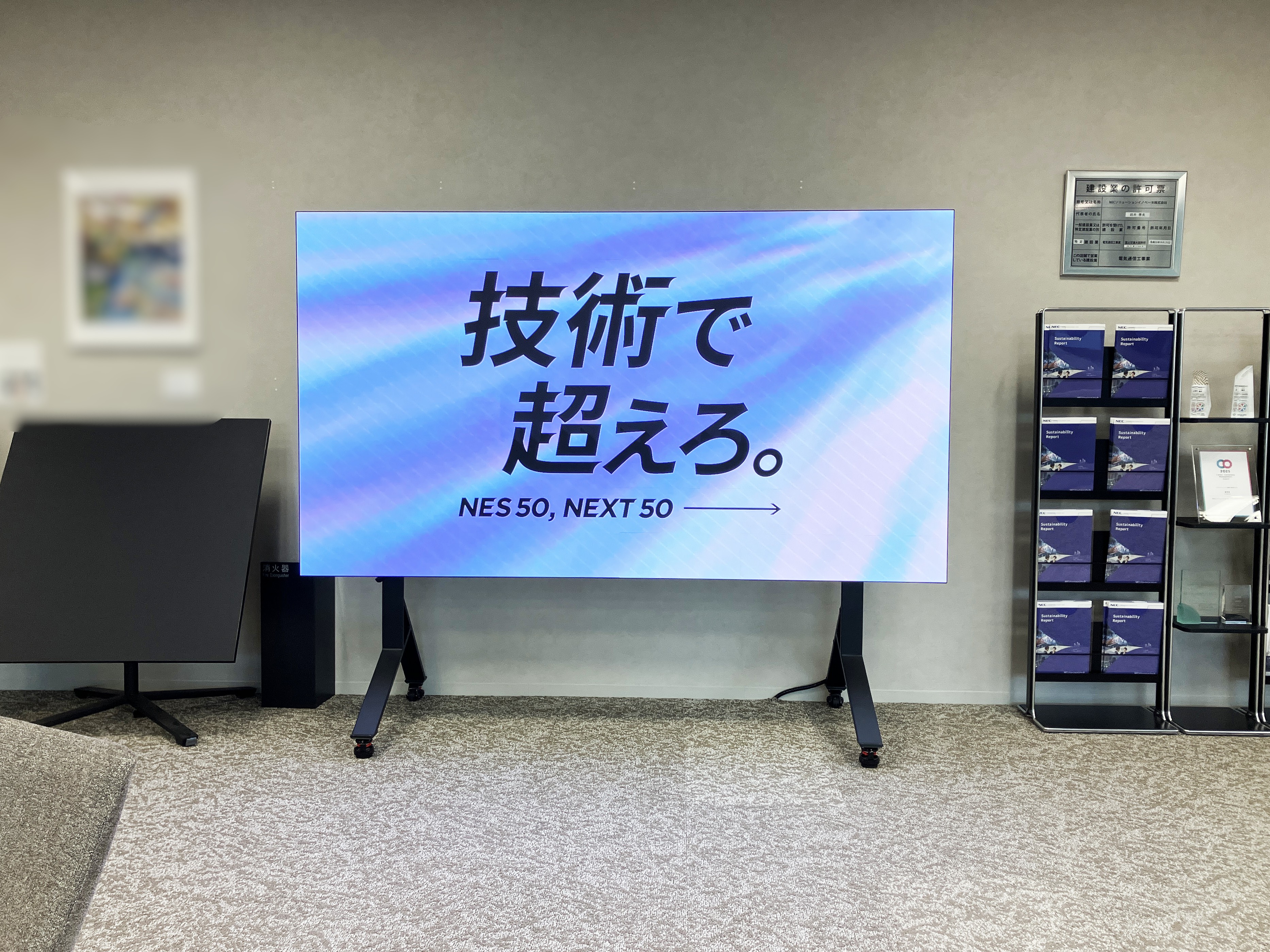 来訪ラウンジを数年前にリニューアルして、お客様をお迎えしていたが、NECソリューションイノベーター創立50thを迎え、映像やビジュアルに意識したリニューアルを検討していた。エントランスの木目からシックな黒調へ変更し、ところどころに造花を置き、ホテルのエントランスを意識。ベースとしたリニューアル計画から、映像を用いたイメージ映像を発信する大型画面を設置。更に大きな壁面を活用し、今まで歩んできた歴史や企業のパーパスを表示。来訪される方へ、NECグループでの存在価値を発信できるスペースとなった。