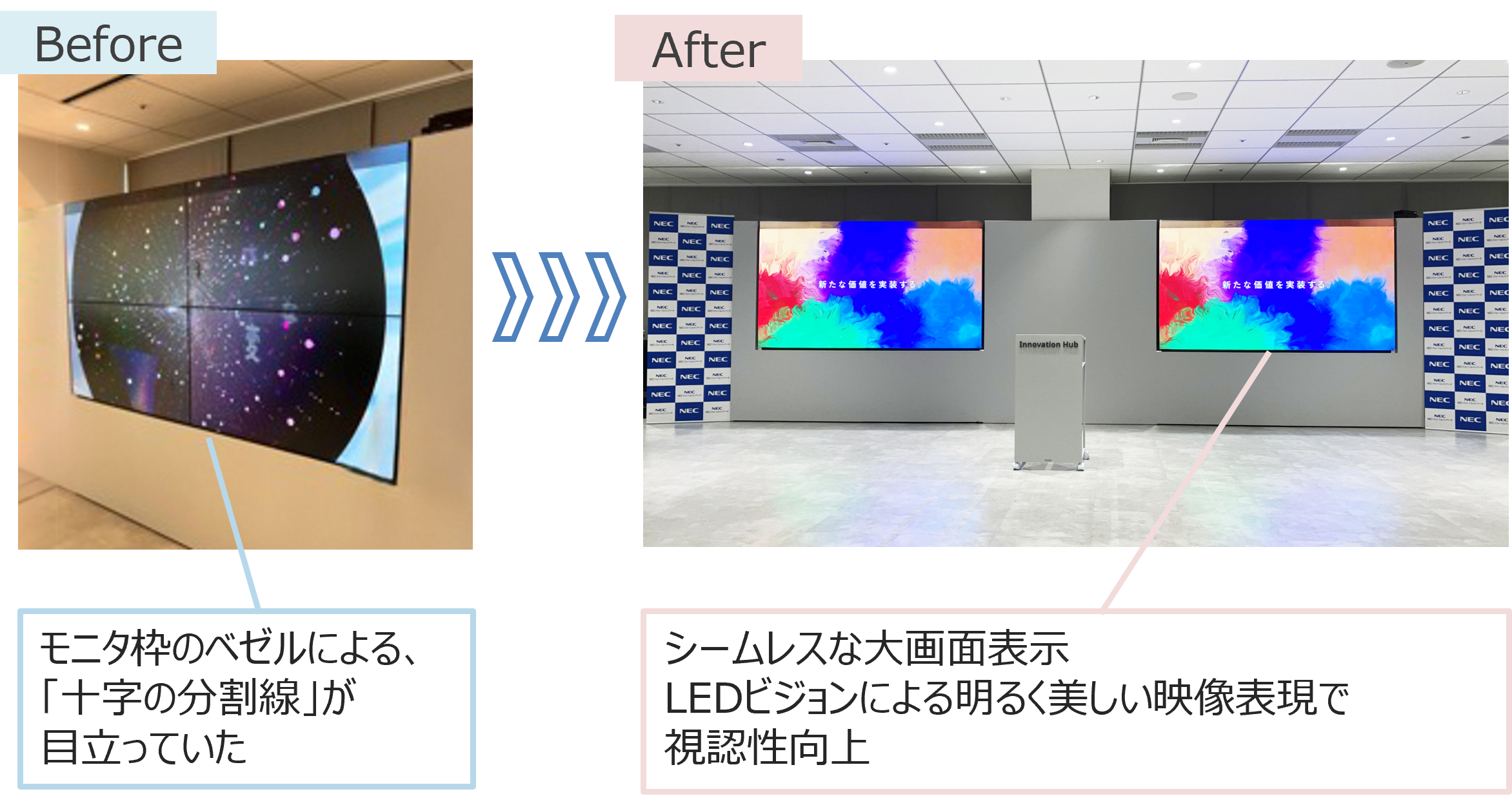 表示が出来ない状態になってしまいます。また修理後もモニタ同士の色合いが合わず、彩度にバラつきが出てしまうことがありました。LEDビジョンは最長 10 年と耐用年数が長く、故障時も部分修理が可能なため、液晶モニタのような全交換や彩度のバラつきがなく、長期的に高品質な映像を維持することができると期待しています。」