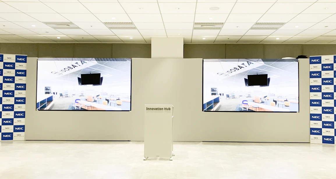 NECグループは、共通の目的として、共創による「社会価値の創造」というPurposeの実現を目指しています。その実現に向け、社内外の共創を促す環境づくりを進めており、 NECソリューションイノベータ本社に設置されているInnovation Hubは、その取り組みの一つです。Innovation Hubは、オープンなスペースに、大きなモニターや音響設備、ソファやラウンジチェアなどを設置。社内イベント、顧客やパートナーも含めた社内外のメンバーのコラボレーションの場として活用されています。